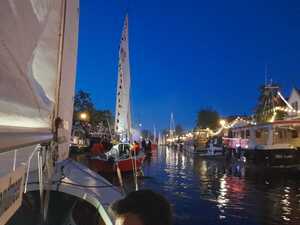 Na onze aanmelding voor de Sneekweek hebben we een berichtje verstuurd om dit jaar weer met de Vlootschouw, de opening van de Sneekweek, te mogen meevaren met onze Rm 311, de Rooje Sturm. Dit werd met instemming ontvangen. Dus lagen we - Esther aan het roer, Lisa en ik aan de genua - vrijdagavond om 17:45 uur weer klaar voor de sleep naar de Kolk. Om 18:30 uur aangekomen in de Kolk bij de Waterpoort even gegeten en een rondje Sneek gedaan tot het begin van de Vlootschouw om 21:45 uur door de grachten van Sneek. Samen met de Tirion 21 en de 2.4 mR waren we de tweede sleep. Het was weer een geslaagde avond met een gezellige sfeer. Om 22:30 kwamen we bij het eindpunt. Daarna werden we teruggesleept naar de haven. Om halftwaalf waren we terug in de haven, even de tent erop en daarna nog een spelletje (en drankje) in de tent.